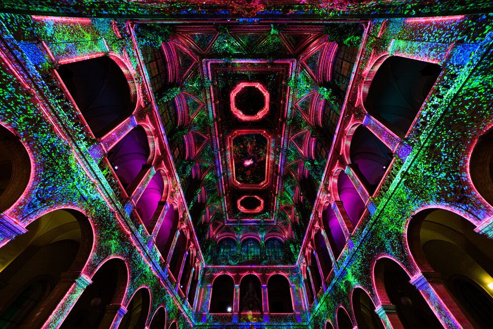El escenario no podría ser más emblemático: la Parroquia de la Sagrada Familia, ubicada en la calle Puebla 144. Al interior del recinto, las proyecciones en movimiento envuelven las paredes y la cúpula, recreando los ciclos de la primavera, el verano, el otoño y el invierno.