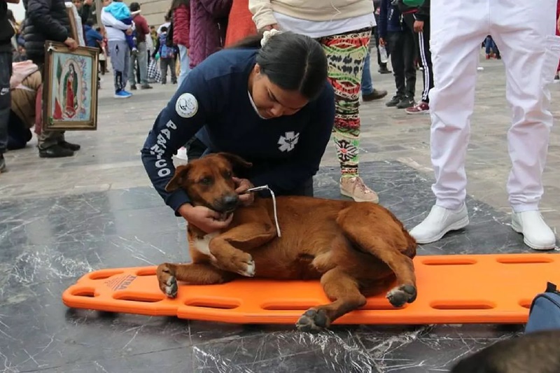 La labor se despliega justo a las puertas del templo, donde los voluntarios recorren banquetas y rincones en busca de animales visiblemente exhaustos, deshidratados o con problemas de salud. Norma Huerta, directora de la organización, explica que muchos de estos perros llegan en condiciones preocupantes tras caminar largas distancias. “Urge sacarlos de ahí”, afirma, al señalar que el objetivo es rescatarlos, atenderlos médicamente, esterilizarlos y buscarles un hogar.
