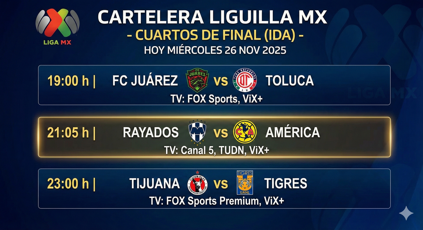Ya se armó la machaca en la Liga MX y la espera terminó para la afición que vive y respira fútbol. Este miércoles 26 de noviembre arranca la «Fiesta Grande» del Apertura 2025 con una cartelera triple que promete no dejar títere con cabeza. Se trata de los duelos de ida de los Cuartos de Final, una etapa donde el margen de error es mínimo y donde, como dicen en el barrio, se separa a los niños de los hombres. La jornada inicia temprano en la frontera y termina casi a medianoche, garantizando una dosis masiva de emociones para cortar la semana.