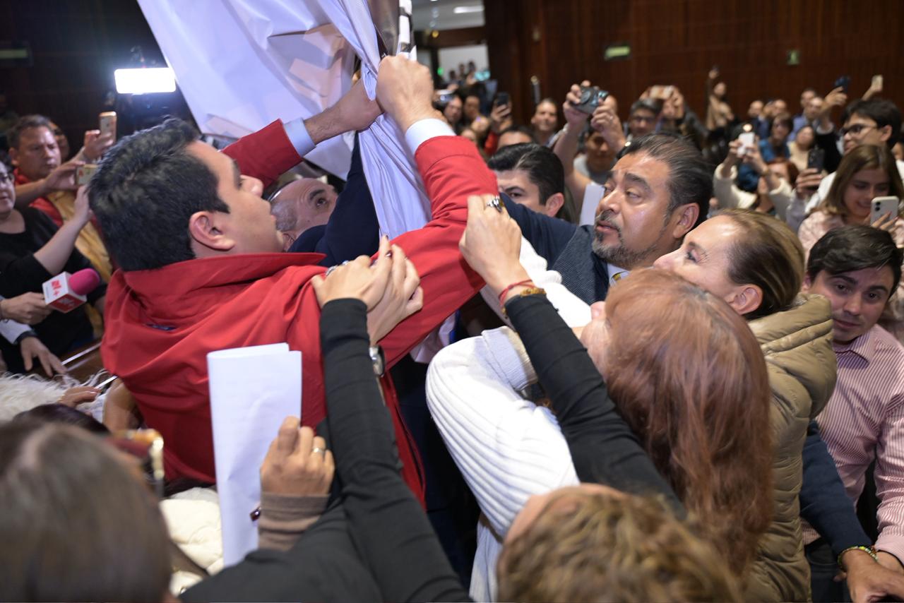 De un lado, los diputados del PRI defendían su derecho a manifestarse; del otro, los legisladores de Morena y del PT exigían respeto a las reglas del recinto y a la integridad de sus compañeras, luego de que algunas diputadas fueran empujadas durante el altercado.