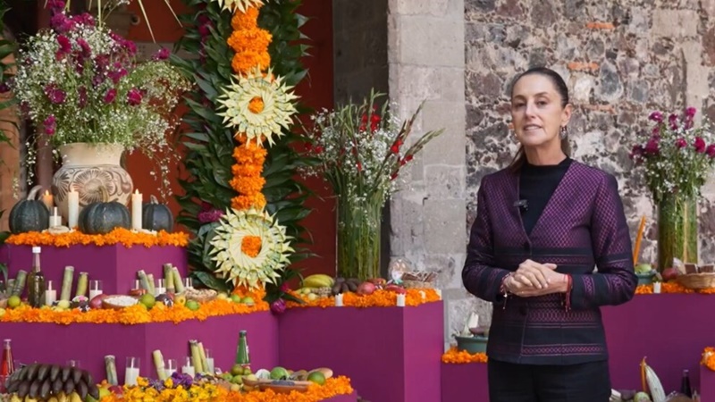 “La ofrenda en Palacio Nacional se llena de flores, colores, canto y fuego. Cada pétalo de cempasúchil marca el camino de regreso para aquellas mujeres que sembraron vida en su paso por la tierra”, escribió la jefa de Gobierno en su cuenta de X.